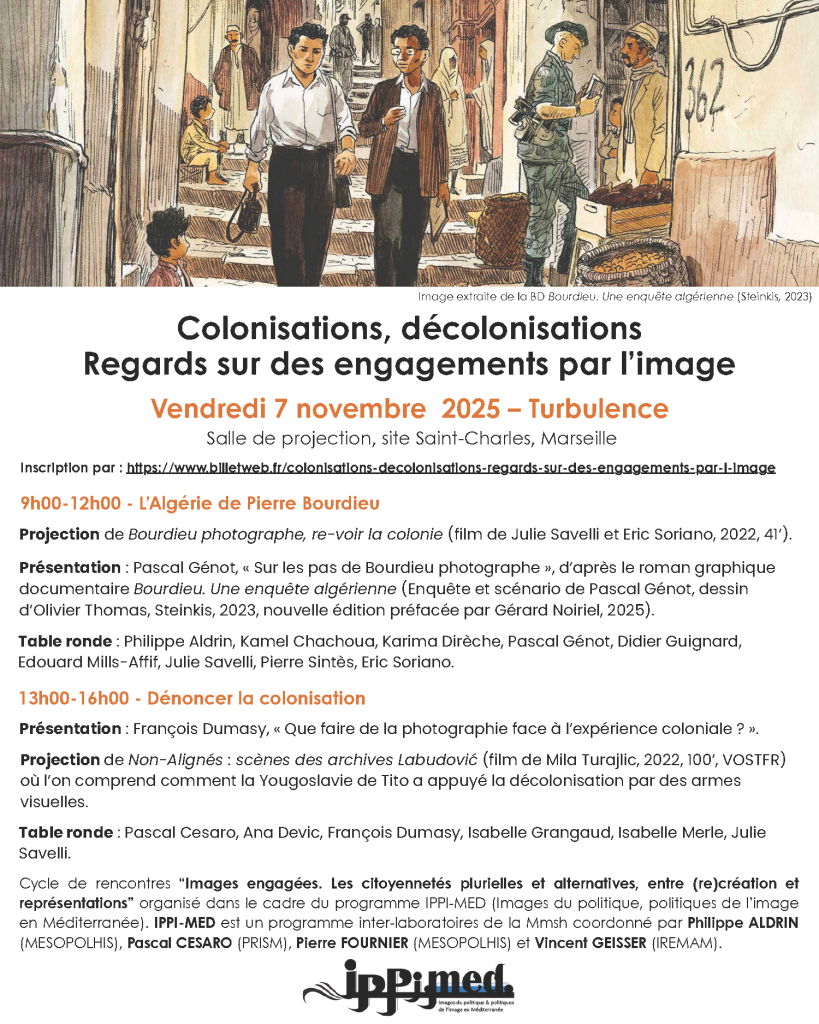 07nov9 h 00 min16 h 00 min9 h 00 min - 16 h 00 min Axe transversal « Images et Sciences sociales ». Rencontres « Images engagées » - Journée 2 « Colonisations, décolonisations. Regards sur des engagements par l’image »