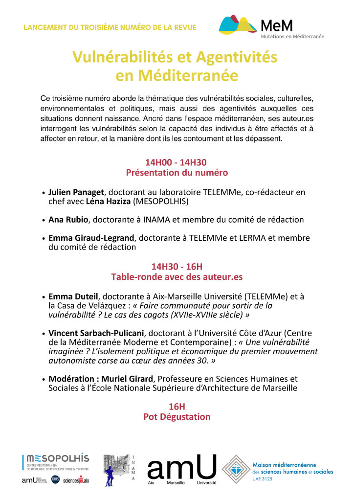 Table-ronde pour le lancement du 3e numéro de la revue Mutations en Méditerranée : « Vulnérabilités et agentivités en Méditerranée »