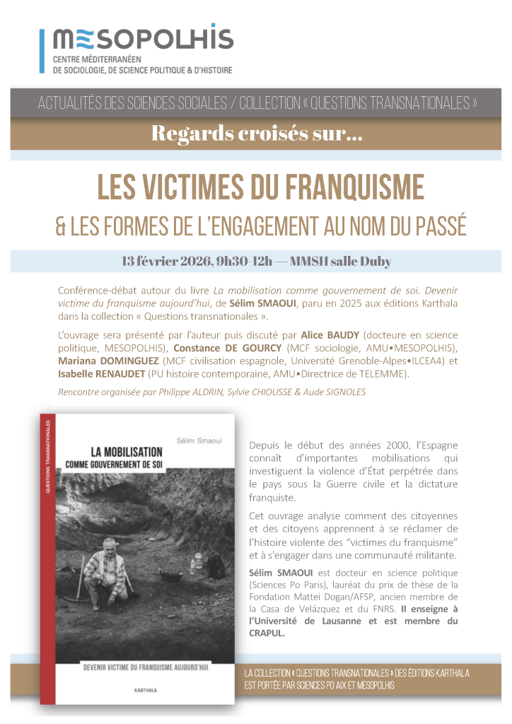 13fev9 h 30 min12 h 30 min9 h 30 min - 12 h 30 min Séminaire de la collection « Questions transnationales » (Karthala) : Sélim Smaoui, « La mobilisation comme gouvernement de soi. Devenir victime du franquisme aujourd’hui »