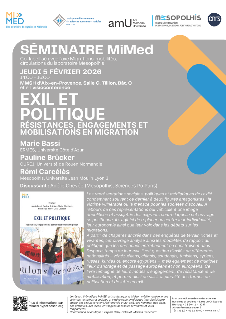 Séminaire MiMed / Axe 2 : présentation de l’ouvrage "Exil et politique" en présence de Marie Bassi, Pauline Brücker et Rémi Carcélès