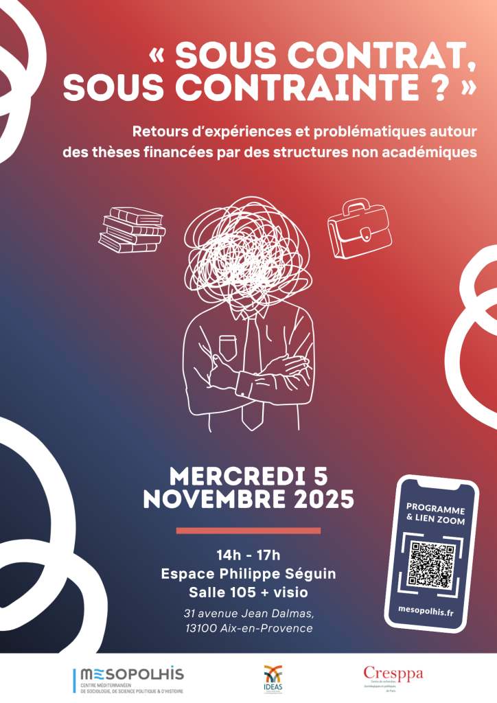 Nevertheless, doctoral students funded by private or public bodies are subject to sometimes paradoxical standards (different timetables between companies and universities, conflicting expectations, multiple demands, incompatible operating systems, etc.). The 'double bind' of contract research, both during the thesis and later in a career, is worth examining. We realised that there were very few forums for discussion about the conditions under which a doctorate is achieved, so we decided to organise a meeting on 5 November 2025 to hear stories and share experiences.