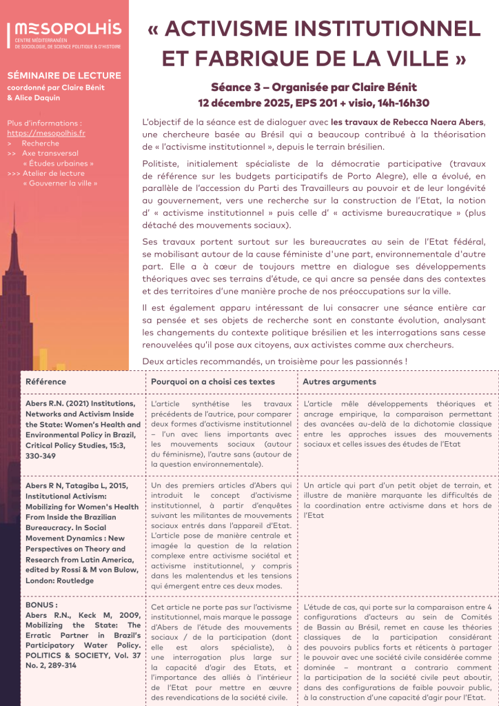 Urban Studies" cross-cutting theme & themes 4 and 6 - "Governing the city" reading workshop. 2025-2026 theme "Institutional activism and the making of the city": session 3